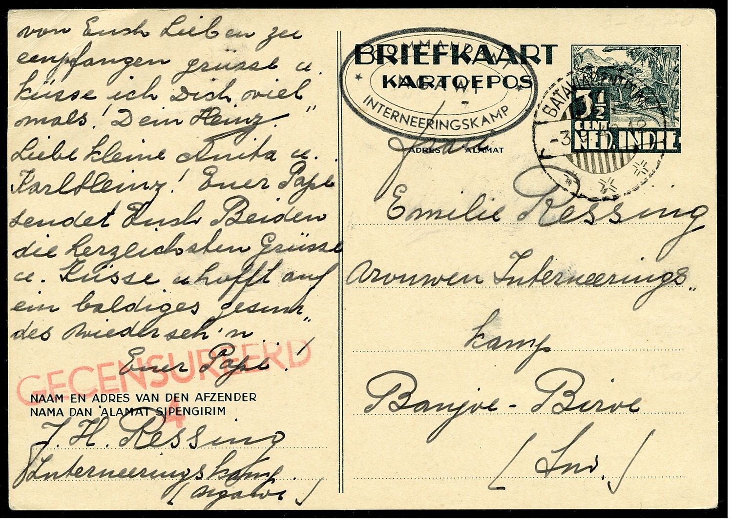 Interneringskampen. Ovaalstempel 'COMMANDANT / INTERNEERINGSKAMP / NGAWI' (deW.KI JO) op gecensureerde bk. via Bataviacentrum 3-9-1940 naar familie in het kamp te Banjoebiroe