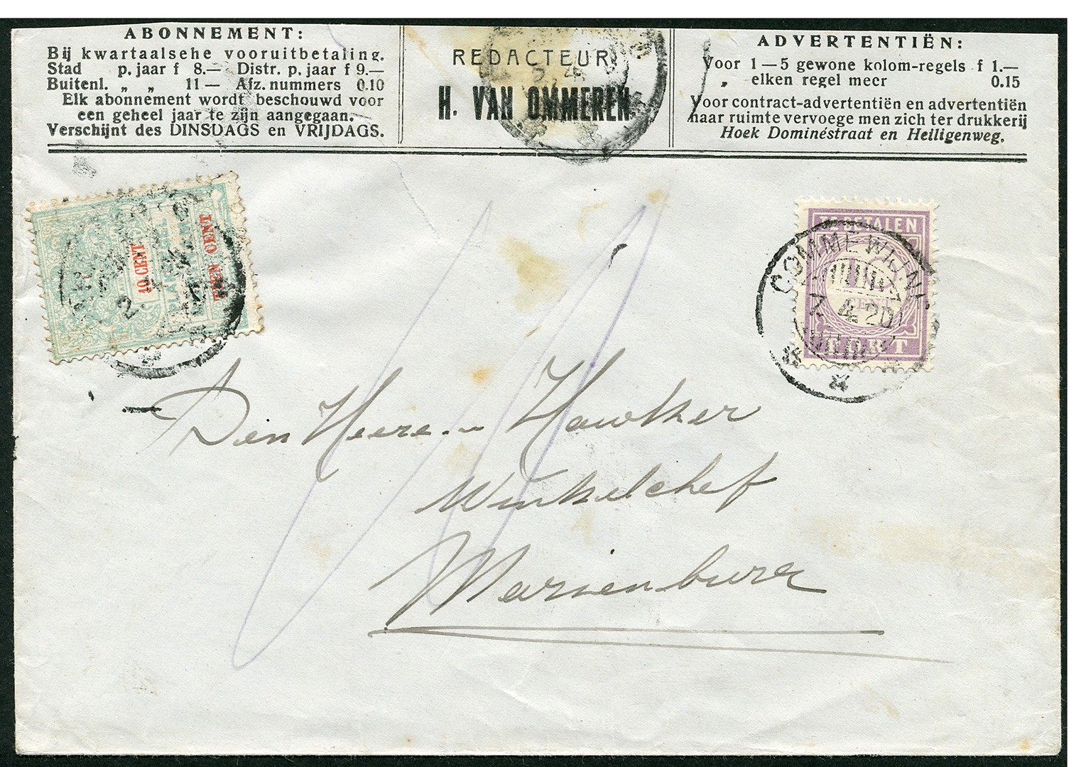 10 Cent plakzegel abusievelijk als frankeerzegel gebruikt op wat smoezelig couvert (bovenzijde iets afgesneden), desondanks afgest. Paramaribo 2-4-1920 naar Mariënburg en voorzien van 10 cent portzegel, afgest. met rivierbootstempel Commewijne 7-4. Curieus poststuk