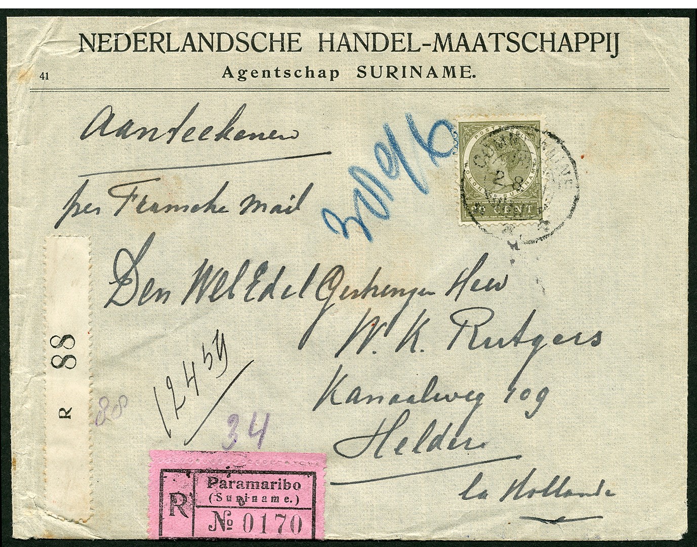 Drie enveloppen waarop aantekenstrookjes van rivierbootdiensten, twee naar Nederland (1921, 1928) en een naar Mariënburg (1920). Schaars