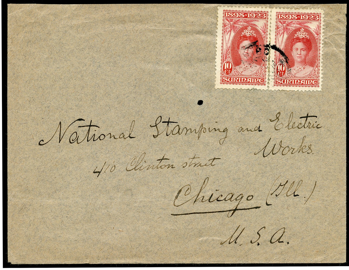 Jubileum 1923. 10 Cent nr. 105 als enkelfrankering op env. naar Nederland, alsmede 2x 10c op env. van Paramaribo naar Chicago 20-2-1924. Schaars op poststuk!