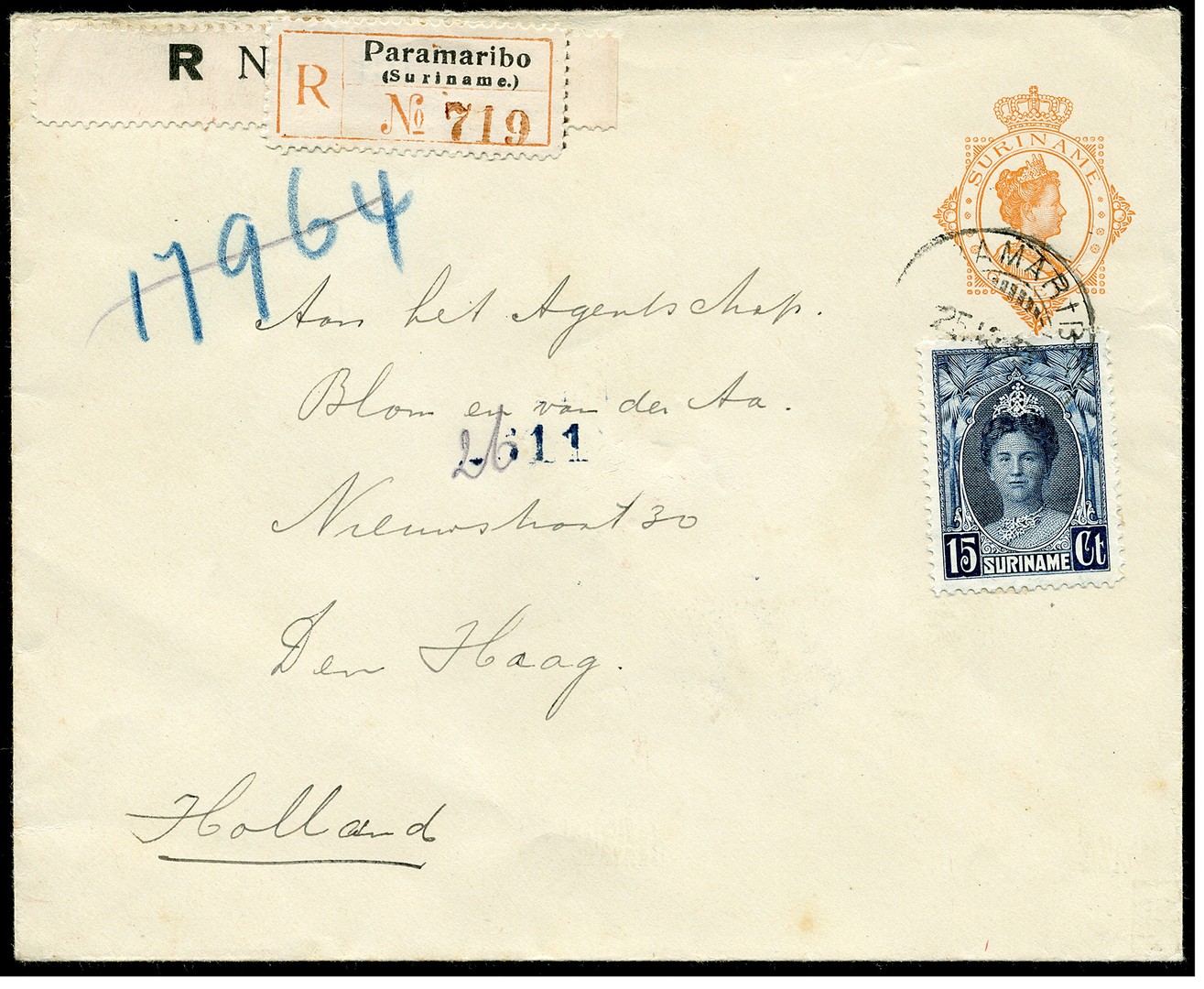 Env. G17 bijgefr. met 15c nr. 120 met als afz. Republiek, aangetekend met strookje van rivierbootdienst, daaroverheen R-strookje van Paramaribo, op 25-10-1933 naar 'sGravenhage 9-11. Bekoorlijk poststuk!