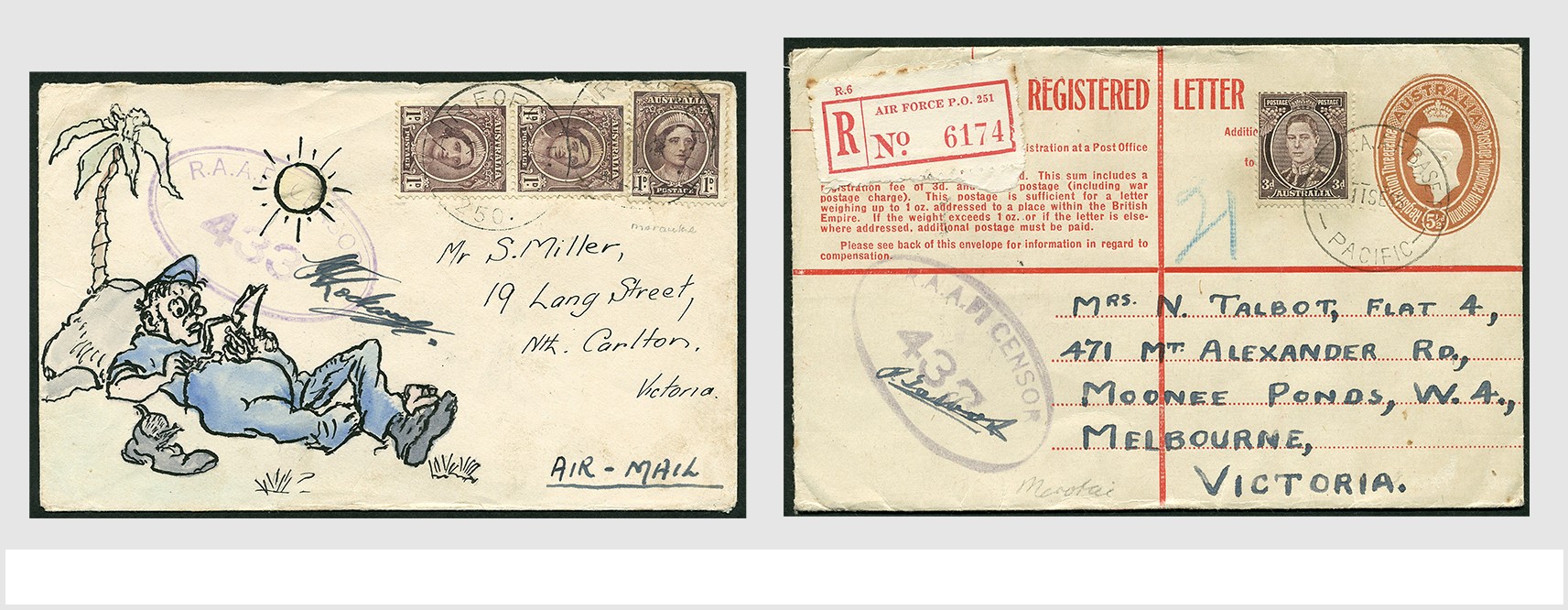 NED.- INDIË POSTHISTORIE. Australische Veldpost 1942-45. Negen bijzondere poststukken o.a. uit Merauke en Morotai, w.o. aangetekend, diverse censuurstempels en stroken, Concession Rate, Dead Letter Office, H.M.A. Ships, Delivery Impracticable, Return to Sender, FPO-stempels, etc. Interessant!