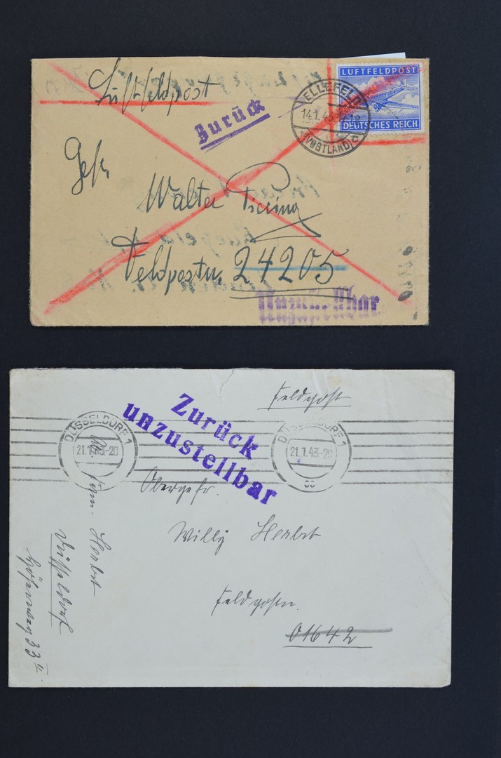 TWEEDE WERELDOORLOG. Twee Duitse veldpostbrieven (waarvan 1 met inhoud) uit januari 1943 naar militairen die deelnamen aan de Slag om Stalingrad, onbestelbaar en 'Zurück'. Historisch