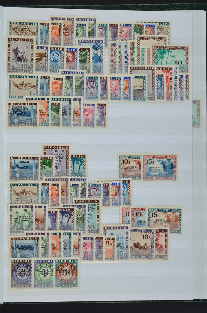 INDONESIË WEENSE DRUKKEN. Enorme vnl. postfrisse engrospartij keurig gesorteerd, incl. souvenirvelletjes w.o. de moeilijke 35-011/011d, veldelen, en tevens diverse zegels en series geplakt op enveloppen, afgestempeld met curieuze stempels zoals van Tandj, Serang en Pandeglang (als type PV2), alsmede wat fiscaalzegels Indonesië, in 2 insteekboeken. Hoge cat. waarde (catalogus Dai Nippon, 2003)