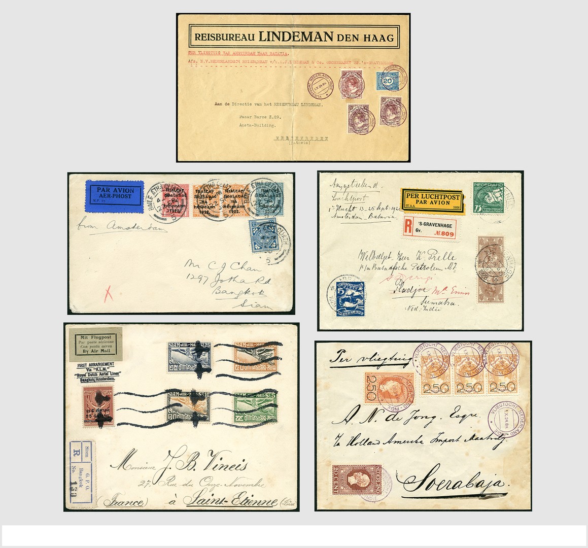 LUCHTPOST KLM-Indiëlijn 1924-30. Verzameling van 76 luchtpoststukken w.o. 2x Van der Hoop 1924 (VH.B.3aI, doch minder mooi), proef- en aanbrengvluchten, Koppenvlucht w.o. met handtekening, trajectpost, etc. gedocumenteerd op tentoonstellingsbladen in 2 klembanden