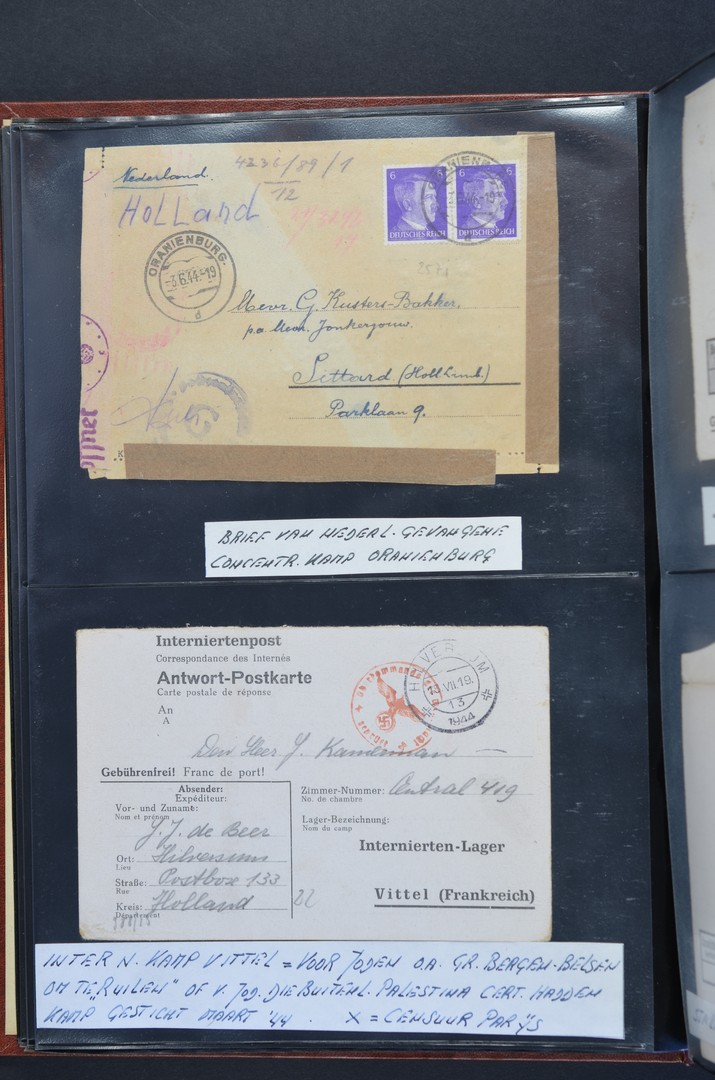 TWEEDE WERELDOORLOG KAMPPOST. 168 Kamppoststukken, voorgedrukte briefkaarten w.o. met aanhangende antwoordkaart, postbladen, enveloppen waarvan diverse nog met inhoud, ontvangstbevestigingen pakketten, afkomstig van een grote verscheidenheid aan concentratiekampen w.o. Auschwitz, Buchenwald, Dachau, Mauthausen en Ravensbrück, naar diverse bestemmingen w.o. Nederland, Palestina en België met meerdere stukken via het Rode Kruis, met vele typen censuurstempels, poststempels, etc. in 2 albums. Uitzonderlijke collectie en in dergelijke omvang en verscheidenheid zelden aangeboden