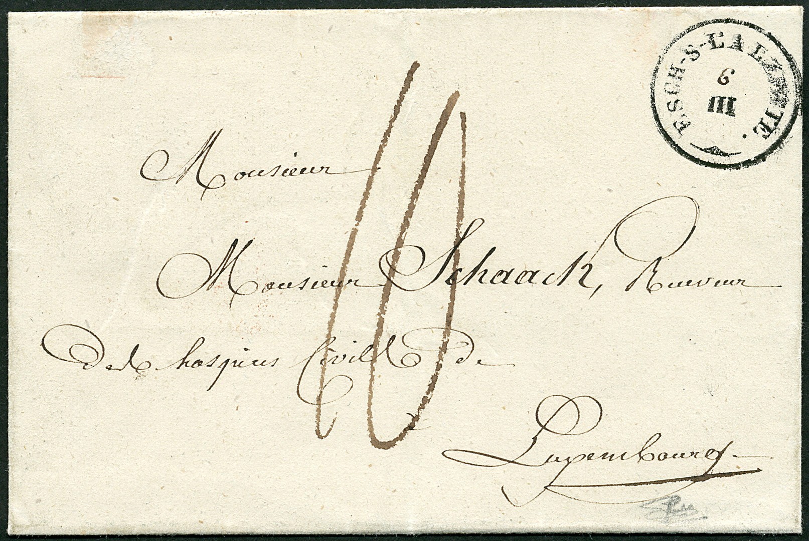 Gouvernement du Grand-Duché' 1843 Pli pour Luxembourg c.à.d.'ESCH-S-ALZETTE 6/III', port '10'. Frappe exceptionnelle du cachet. Au verso cachet d'arrivée en rouge 'LUXEMBOURG 6 MARS 1843'. 1843 Faltbrief nach Luxemburg mit Kreisstempel 'ESCH-S-ALZETTE 6/III', Porto vom Empfänger zu bezahlen '10'. Aussergewöhnliche Stempelschlag. Auf der Rückseite des Briefes ein roter Ankunftstempel 'LUXEMBOURG 6 MARS 1843', sign. Goebel