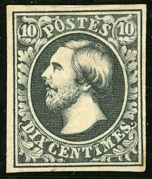ESSAI du 10 centimes nuance 'noir bleuâtre' avec tête d'voire et gomme originale. Probe der 10 centimes, Nuance 'grünlichschwarz', Rückseite blaulich mit originalem Gummi.