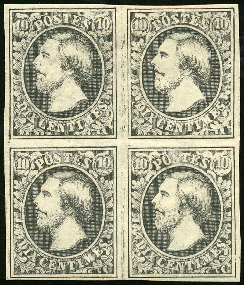LES REIMPRESSIONS 10 CENTIMES et 1 SILBERGROSCHEN 10 centimes 'noir', Réimpression, Bloc de Quatre sur papier filigrané avec gomme (très rare). 10 centimes 'schwarz' Neudruck im Viererblock auf gummiertes Papier mit Wasserzeichen (sehr selten). Cert. Goebel (2009)