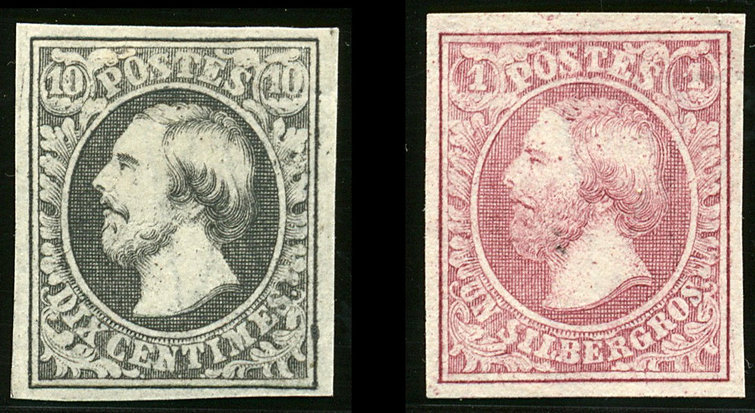 10 centimes 'noir' et 1 sg 'rose', Réimpressions sur papier filigrané resp. avec et sans gomme. 10 centimes 'schwarz' und 1 sg. 'rosa', Neudrücke auf resp. gummierten und ungummierten Papier mit Wasserzeichen.