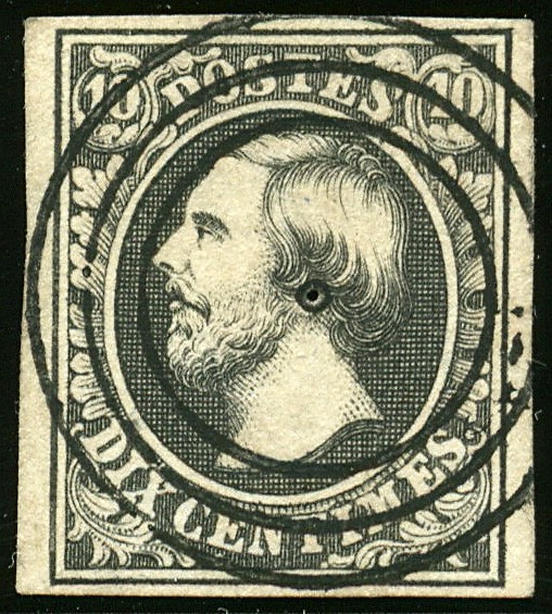 1b, 10 cts 'noir verdâtre', 1er tirage, oblitération centrale à pointe perforante, Superbe. 1b, 10 cts 'leicht grünlichschwarz', 1. Ausgabe, zentral entwertet durch 3-Kr. mit Stempelspitze, Luxusstück. Sign. Goebel