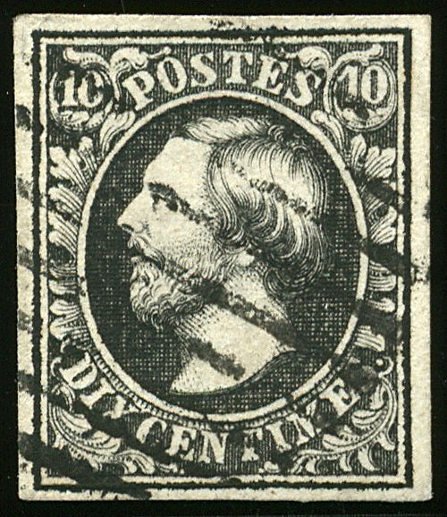 1d, 10 cts 'noir velours', filigrane inversé, oblitération 9 barres, TB. 1d, 10 cts 'samtschwarz', spiegelverkehrtes Wasserzeichen, entwertet mit 9-Balkenstempel, Pracht. Sign. Goebel