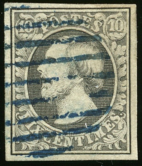 1j, 10 cts 'noir gris', oblitération 9 barres en bleu, rare, TB. 1j, 10 cts 'schwarzgrau', entwertet mit 9-Balkenstempel in blau, ein seltenes Prachtstück. Cert. Goebel (2008)