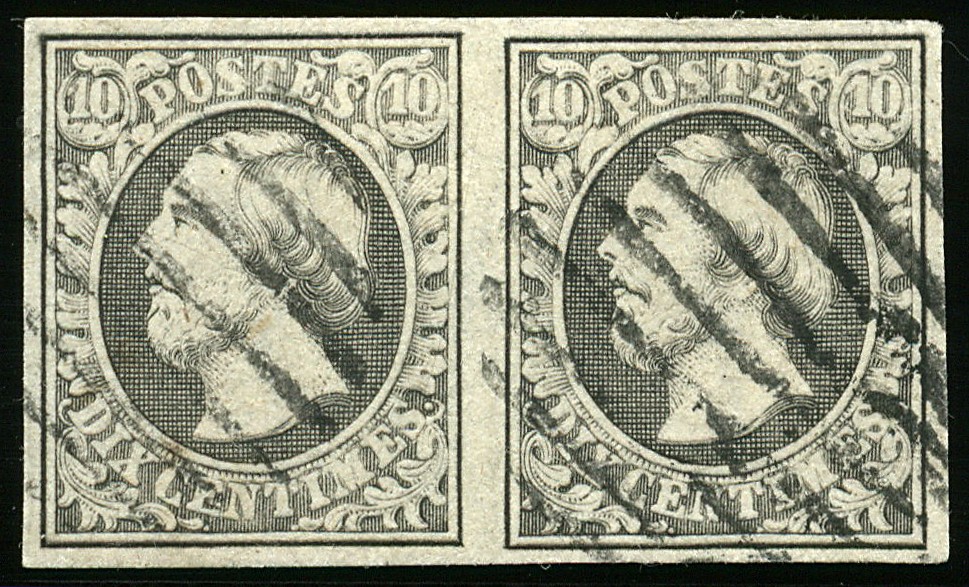 1j, 10 centimes 'gris noir', paire horizontale, oblitération 9 barres. TB 1j, 10 centimes 'schwarzgrau', waagerechtes Paar entwertet mit 9-Balkenstempel. Pracht. Sign. Demuth BPP