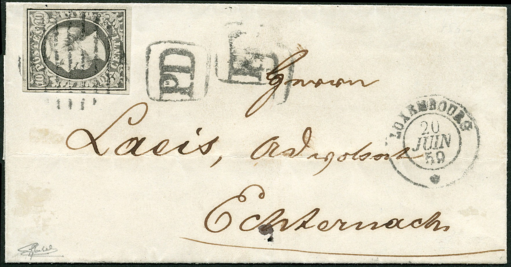 1j, 10 centimes 'gris noir', sur petite lettre pour Echternach, oblitération 9 barres et LUXEMBOURG 20/JUlN/59. 1j, 10 centimes 'schwarzgrau', auf kleinem Brief nach Echternach, entwertet mit 9-Balkenstempel und nebengeztem DKr. LUXEMBOURG 20/JUIN/59. Cert. Goebel (2009)