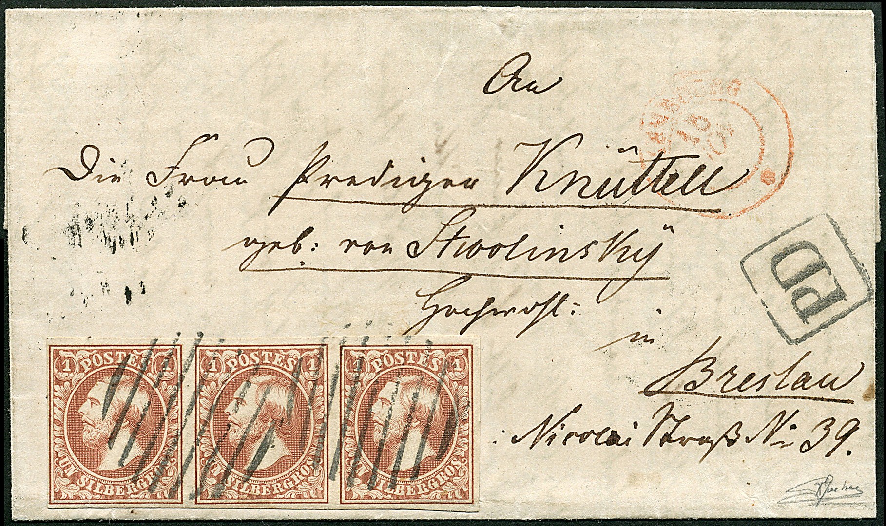 2c, 1 silbergroschen 'brun rouge' bande de trois sur lettre pour Breslau, (tarif 3ème rayon), oblitération 9 barres et c.à.d. LUXEMBOURG 15 NOV (53) en rouge. TB 2c, 1 Silbergroschen 'braunrot', Dreierstreifen auf Brief nach Breslau (Tarif 3. Zone), entwertet mit 9-Balkenstempel und roter DKr. LUXEMBOURG 15 NOV (53) Pracht. Cert. Goebel (2009)