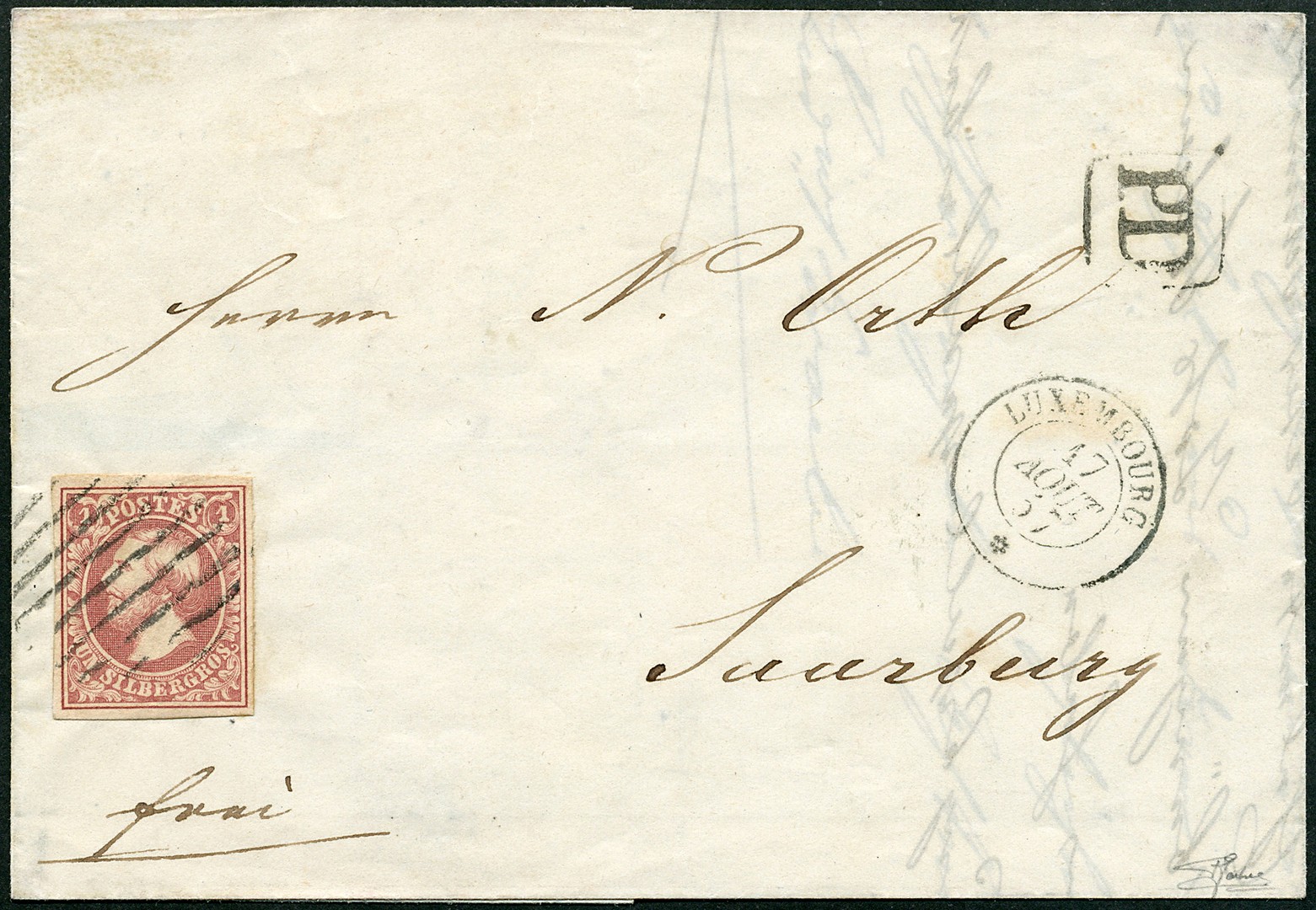 2f, 1 silbergroschen 'chair foncé', sur lettre pour Saarburg, (1er rayon), oblitération 9 barres et cachet à date LUXEMBOURG 17 AOUT 57, TB 2f, 1 Silbergroschen 'dunkel fleischfarben' auf Brief nach Saarburg (1. Zone), entwertet mit 9-Balkenstempel und DKr. LUXEMBOURG 17 AOUT 57, Pracht. Cert Goebel (2009)