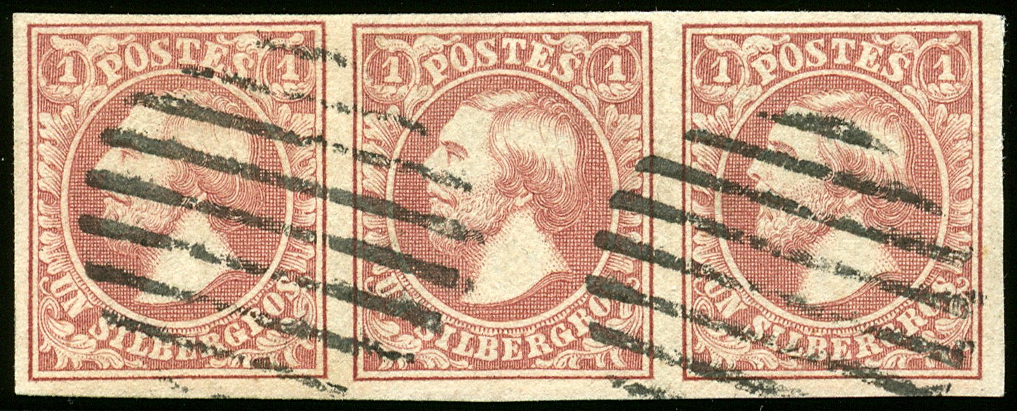 2c, 1 silbergroschen 'brun rouge', bande de trois, oblitération 9 barres, TB 2c, 1 sg 'braunrot', Dreierstreifen, entwertet mit 9-Balkenstempel, Pracht.