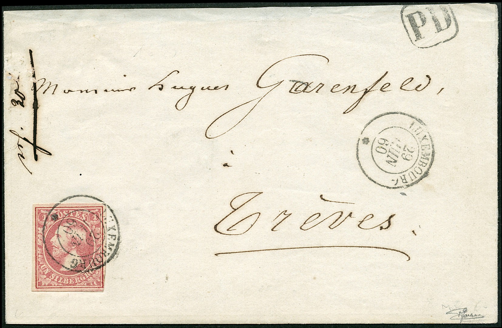 2h, 1 silbergroschen 'rose carminé foncé', dernier tirage, sur lettre pour Trèves, (1er rayon), oblitération avec cachet à date LUXEMBOURG 29 JUIN 60, tres rare, Superbe 2h, 1 sg 'dunkelkarminrosa', letzte Auflage, auf Brief nach Trier (1. Zone), entwertet mit DKr. LUXEMBOURG 29 JUIN 60, sehr selten, Luxus. Cert. Goebel (2012)