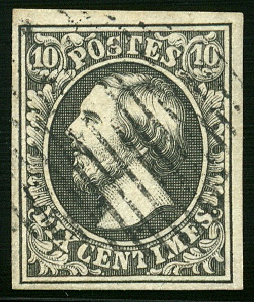 1b, 10 centimes 'noir verdâtre', 1er tirage, impression fine, oblitération Colosse à 26 barres, rare, Superbe 1b, 10 cts 'grünlichschwarz', 1. Auflage, feiner Druck, entwertet mit Riesenstempel 26 Balken van Luxemburg-Stadt, selten, Luxusstück. Cert. Goebel (2008)
