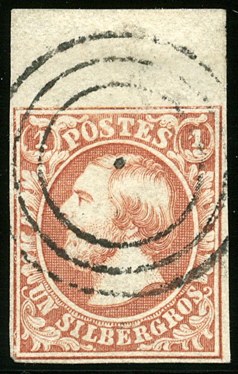BUREAU D'ETTELBRÜCK 2e, 1 sg 'vermillion' filigrane normal, grand haut de feuille, oblitération 3 cercles, Exceptionnel! 2e, 1sg 'zinnoberrot', normales Wasserzeichen, mit grossen Bogenoberrand, entwertet met Dreikreisstempel. Sehr seltenes Stück! Cert. Goebel (2009)