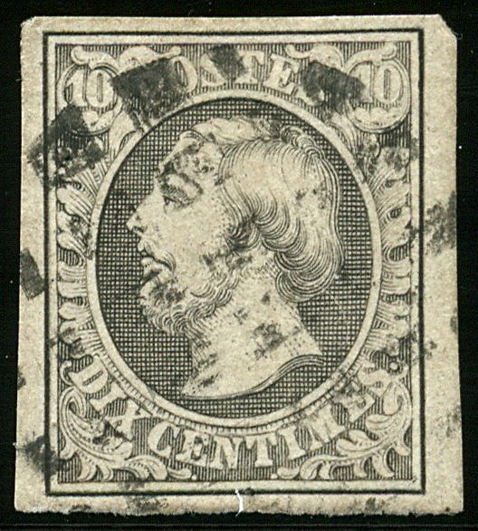 BUREAU DE FRISANGE 1j, 10 centimes 'gris noir', oblitération "Dés de Frisange", rare, Superbe! 1j, 10 cts 'schwarzgrau', entwertet mit "Würfenstempel von Frisange", sehr selten, Pracht! Cert. Goebel (2009)