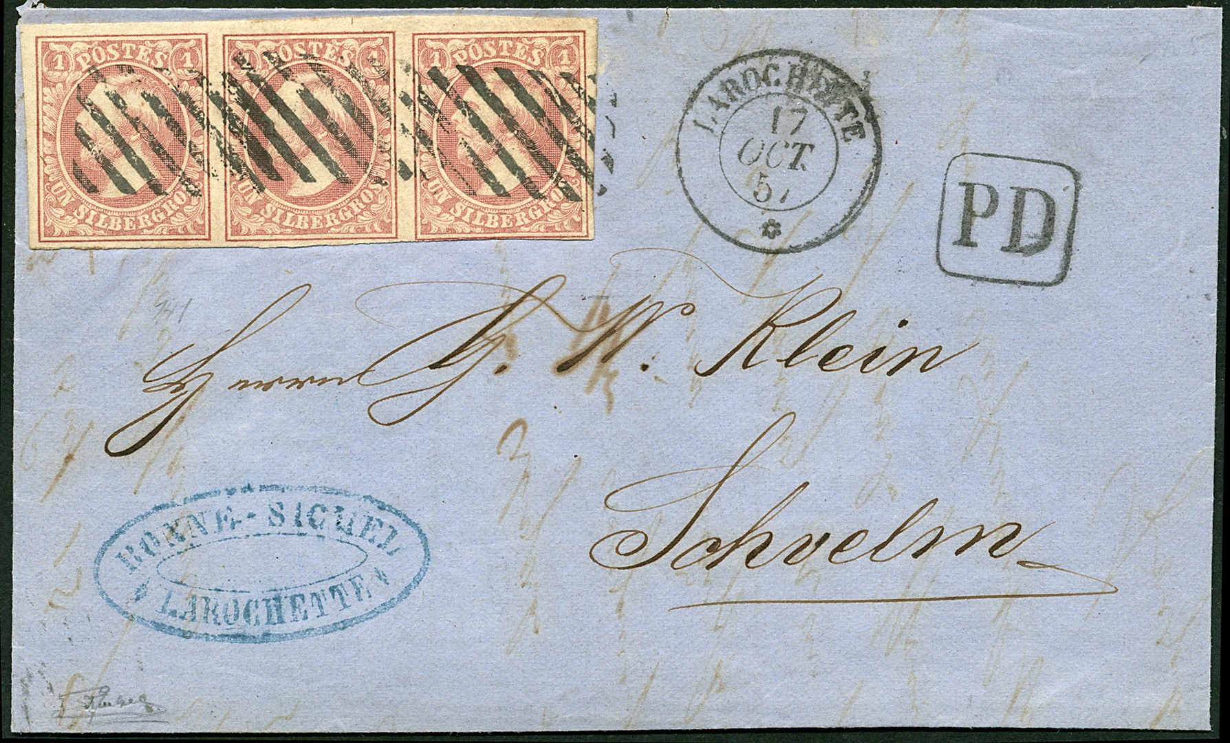 BUREAU DE LAROCHETTE 2f, 1 silbergroschen 'chair foncé', bande de trois sur lettre pour Schvelm, (3ème rayon), oblitération rurale à barres et c.à.d. LAROCHETTE 17/OCT/57. Superbe! 2f, 1 Silbergroschen 'dunkel fleischfarben', Dreierstreifen auf Brief nach Schvelm (3te Zone), entwertet mit rechteckigen Balkenstempel und DKr. LAROCHETTE 17/OCT/57, Luxus! Sign. Goebel
