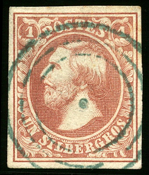 BUREAU DE MERSCH 2b, 1 sg 'brun roux clair', 1er tirage, oblitération 3 cercles à pointe perforante de Mersch en vert, Superbe! (Cachet très rare sur le 1 sg) (ex. collection Pelignon) Cert. Goebel (2013): ... "deux pièces connues à ce jour". 2b, 1 sg 'hell rostbraun', erste Auflage, entwertet mit Dreikreisstempel in grün mit Stempelspitze von Mersch. Luxusstück! (sehr seltener Stempel auf einen 1 sg) (ex. Sammlung Pelignon), Cert. Goebel (2013): ..."bis heute nur 2 ex. bekannt)