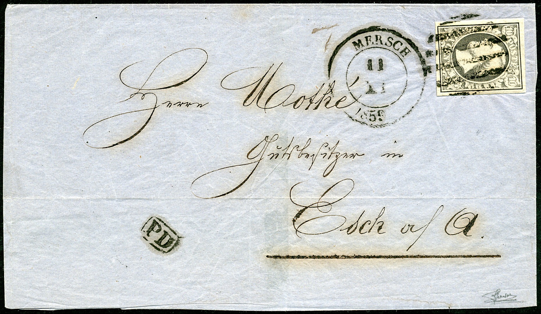 BUREAU DE MERSCH 1j, 10 centimes 'gris noir', sur lettre pour Esch-sur-Alzette, oblitération 6 grosses barres et grand cachet à date (type belge) de MERSCH 11/XI/1859. Superbe. 1j, 10 cts 'schwargrau', auf Brief nach Esch-sur-Alzette, entwertet mit 6 dicken Balken und DKr. (belgischer Type) MERSCH 11/XI/1859, Pracht. Cert. Goebel (2009)