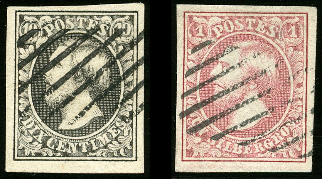 BUREAU DE REMICH 1a, 10 centimes 'noir foncé' et 2h, 1 sg 'rose carminé', les deux ex avec oblitération rurale inverse de Remich. Cert. Goebel (2009): ..."Qualité exceptionel et particulièrement rare sur le 1 sg, dont on ne connait que 4 ex avec cette oblitération et dont celui-ci est le plus beau..Superbe" 1a, 10 cts 'schwarz' und 2h, 1 sg 'karminrosa' die zwei Marken entwertet mit spiegelverkehrtem Balkenstempel von Remich. Diese beide Marken sind die einzigen in einem sehr guten Zustand! Sehr selten! Cert. Goebel (2009),
