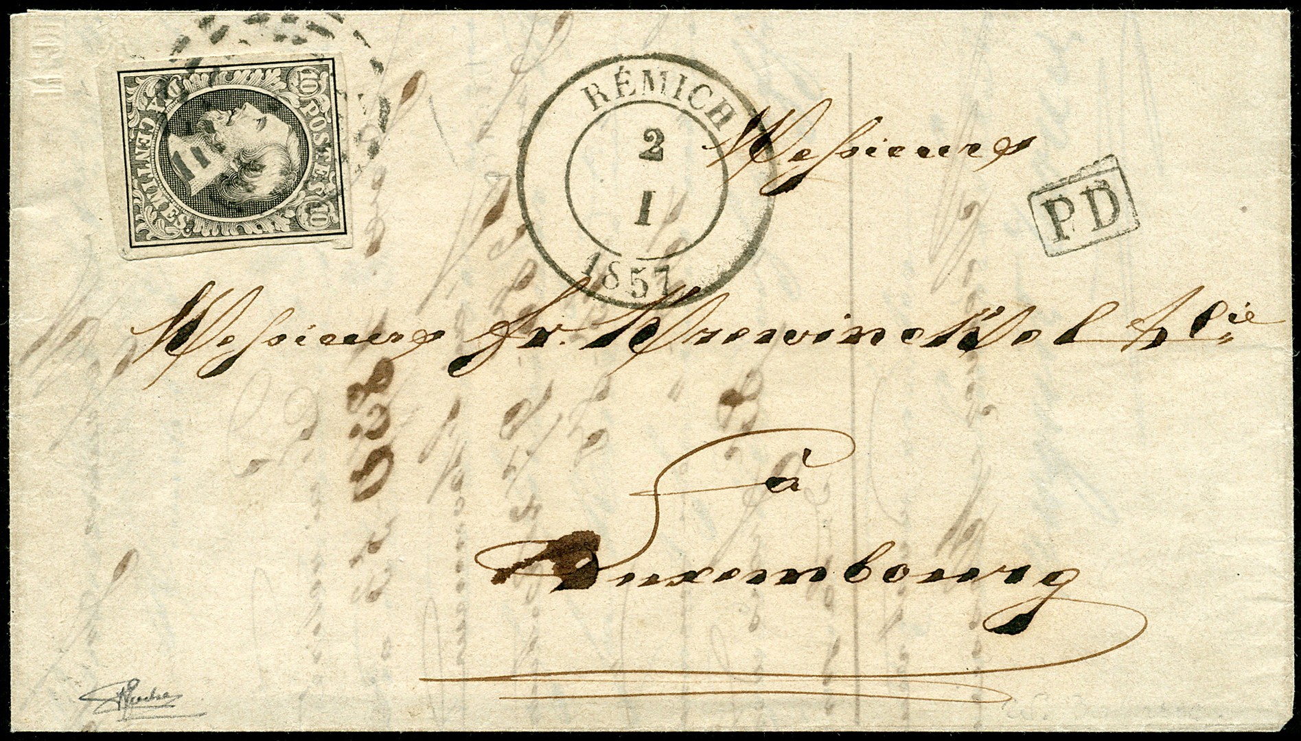 BUREAU DE REMICH 1j, 10 centimes 'noir gris' sur lettre vers Luxembourg, oblitération 3 cercles brisés et c.à.d. REMICH 2/1/1857. TB 1j, 10 cts 'schwarzgrau' auf Brief nach Luxemburg, entwertet mit unterbrochene Kreisestempel und DKr. REMICH 2/1/1857, Pracht. Cert. Goebel (2013)