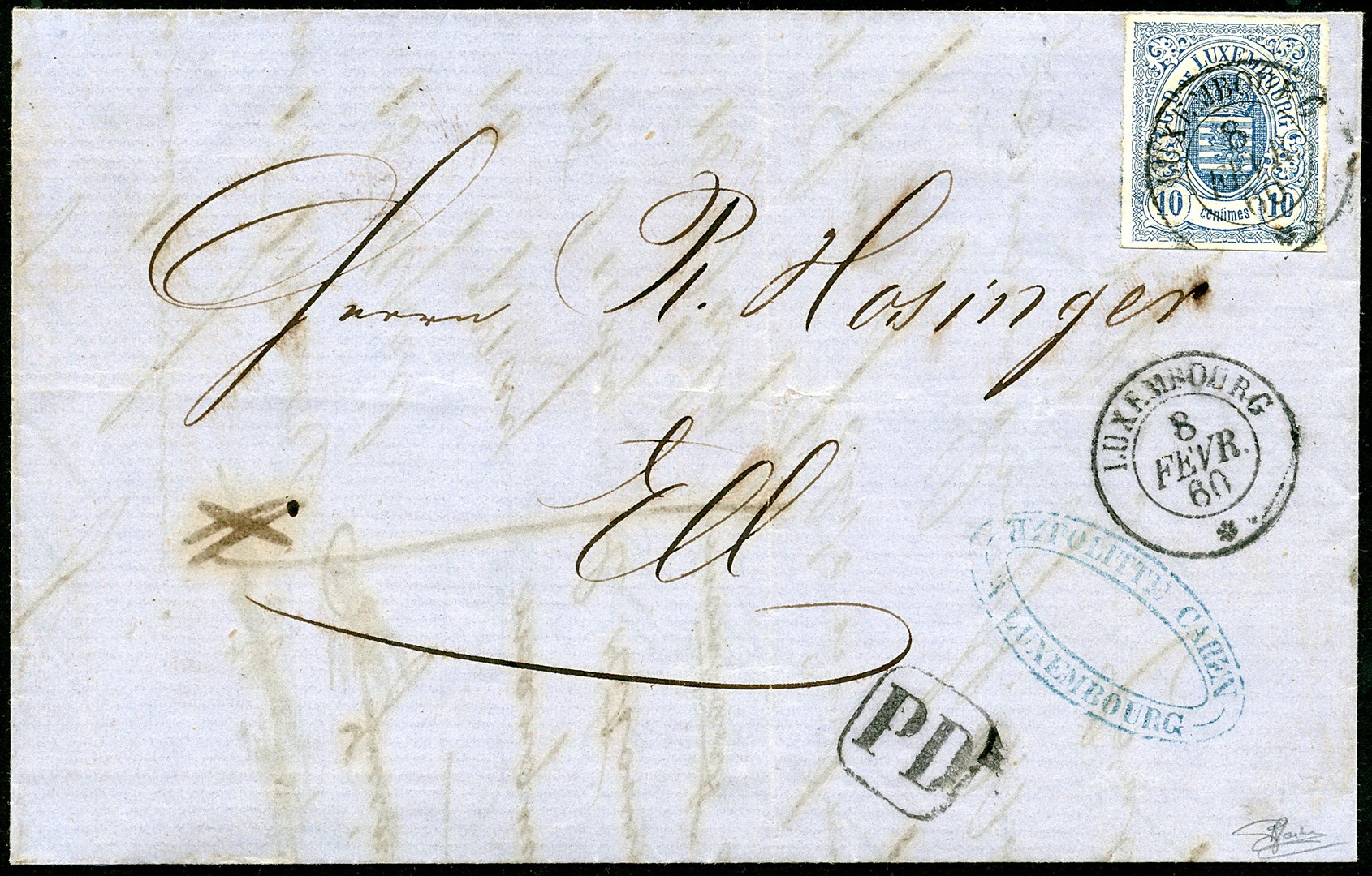 BUREAU DE LUXEMBOURG-VILLE Mi.6, 10 centimes 'bleu-noir' avec grandes marges sur lettre pour Ell, oblitération c.à.d. LUXEMBOURG 8/FEVR./60. Mi.6, 10 cts 'schwarzblau', breitrandiges Prachtstück auf Brief nach Ell, entwertet mit DKr. LUXEMBOURG 8/FEVR./60, tadellose Erhaltung. Cert. Goebel (2012)