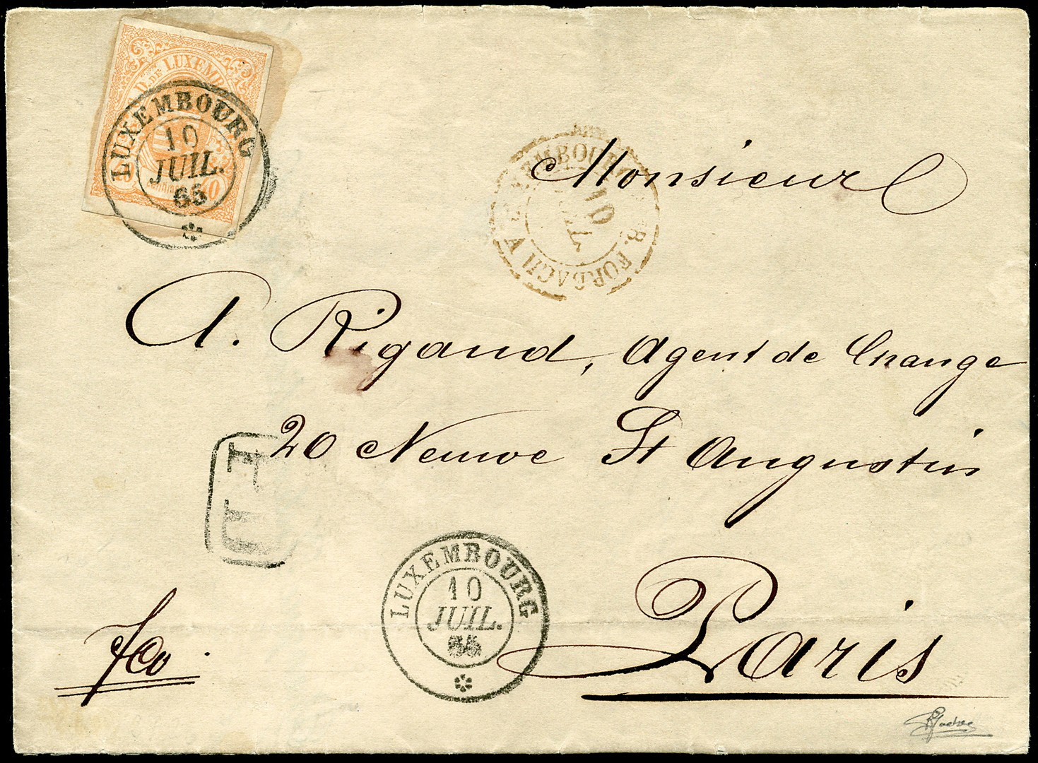 BUREAU DE LUXEMBOURG- VILLE, Mi.11, 40 centimes 'orange', avec grandes marges sur lettre pour Paris, bas de feuille, oblitération c.à.d LUXEMBOURG 10/JUIL./65, et cachet de passage rouge LUXEMBOURG-FORBACH. Une des plus belles lettres cunnues. Superbe Mi.11, 40 cts 'orange', breitrandiges Prachtstück mit Bogenunterrand auf Brief nach Paris mit DKr. LUXEMBOURG 10/JUIL./65 und rotem Durchgangsstempel LUXEMBOURG-FORBACH Einer der schönsten bekannten Briefen. Cert. Goebel (2009)