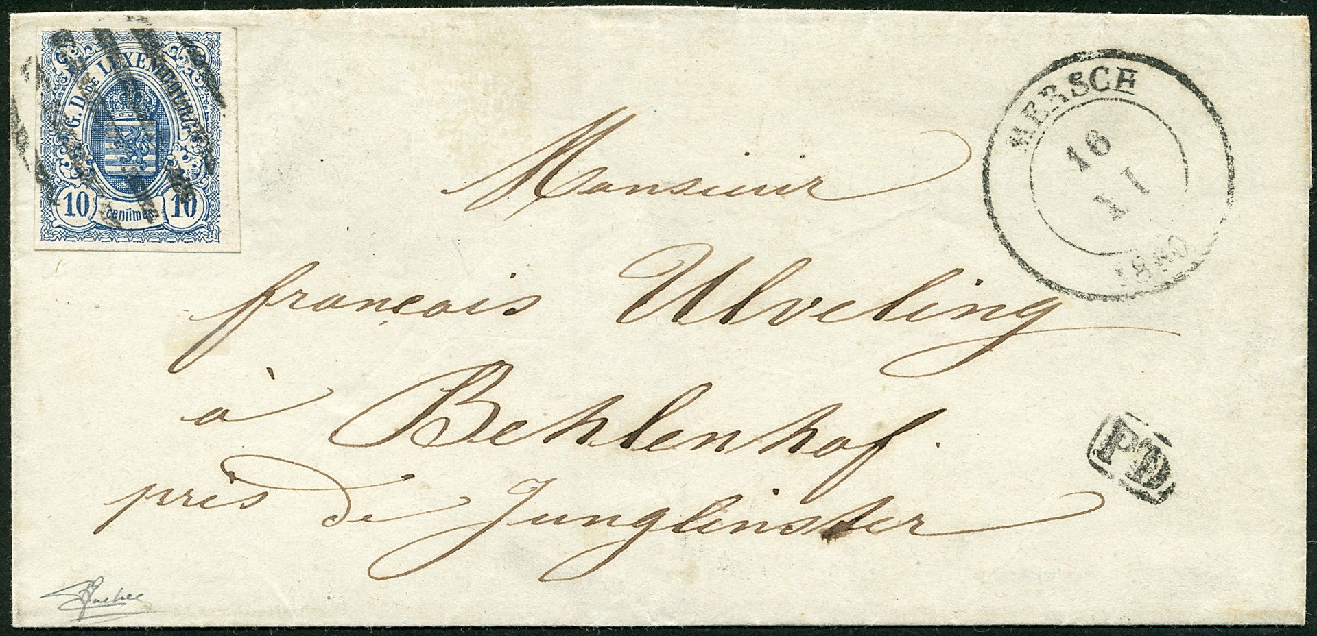 BUREAU DE MERSCH, Mi.6, 10 centimes 'bleu-noir', sur lettre pour Behlenhof près de Junglinster, bord de feuille, oblitération 6 grosses barres et grand c.à.d. (type belge) MERSCH 16/XI/1860. Superbe Mi.6, 10 cts 'schwarzblau' breitrandiges Prachtstück mit rechtem Bogenrand auf Brief nach Behlenhof bei Junglinster, entwertet mit 6 grossen Balken und DKr. MERSCH 16/XI/1860 (belgischer Type). Cert. Goebel (2012)