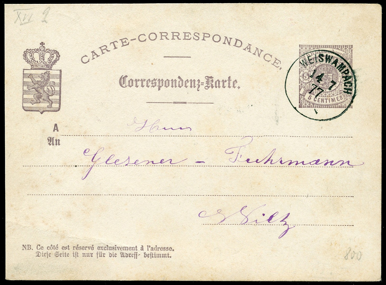 BUREAU DE WEISWAMPACH, 1877/14/7 - WEISWAMPACH, Carte-Correspondance, il s'agit de l'entier postal No 12 (5 centimes) avec cachet d'arrivée au verso WILTZ 15/7/77. 1877/14/7 - WEISWAMPACH, Correspondenz-Karte. Es handelt sich um eine Ganzsache No.12 (5 Centimes) mit Ankunftstempel auf der Rückseite von WILTZ 15/7/77.