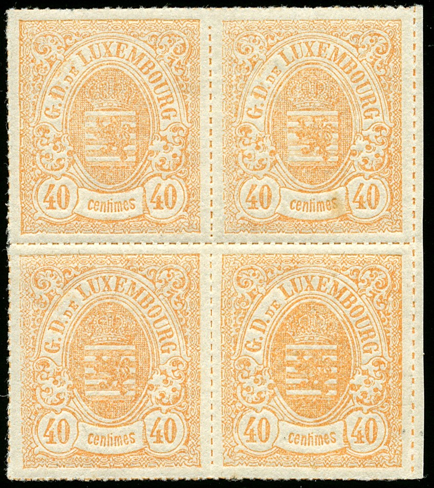 Mi.23b, 40 centimes 'jaune-orange' bloc de quatre, neuf, 2 ex avec charnière, 2 ex sans charnière, TB Mi.23b, 40 cts 'gelborange', ungebrauchter Viererblock mit 2 postfrische ex. in tadelloser Erhaltung.