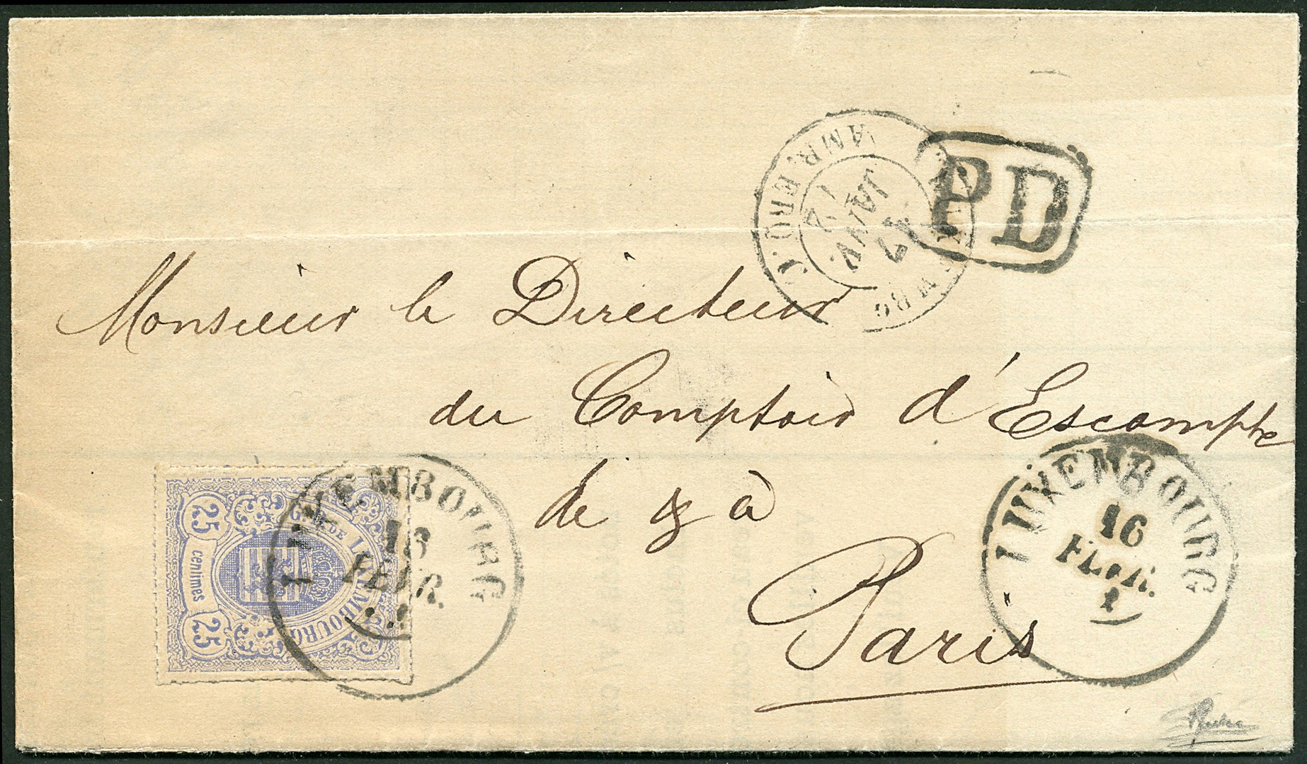 BUREAU DE LUXEMBOURG-VILLE, Mi.20, 25 centimes 'outremer', sur lettre pour Paris, oblitération c.à.d. LUXEMBOURG 16/FEVR/72. Mi.20, 25 cts 'ultramarin', auf Brief nach Paris, entwertet mit Kreisstempel LUXEMBOURG 16/FEVR/72 und Transitstempel. Cert. Goebel (2009)