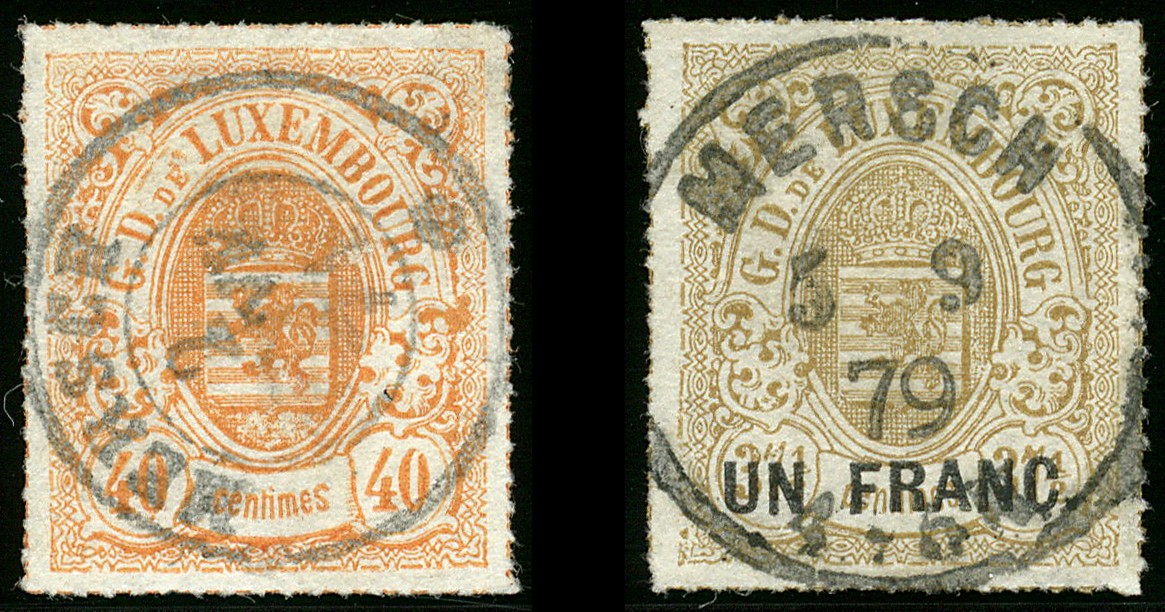 BUREAU DE MERSCH , Mi.23, 40 centimes 'rouge-orange', et Mi.25, Un Franc sur 37½ cts 'gris brun', oblitération centrale avec cachet à date de Mersch. TB Mi.23, 40 cts 'rotorange', und Mi.25, Un Franc auf 37½ cts 'graubraun', beide zentral entwertet mit Kreisstempel von Mersch. Einwandfreie Qualität! Sign. Demuth BPP und Goebel