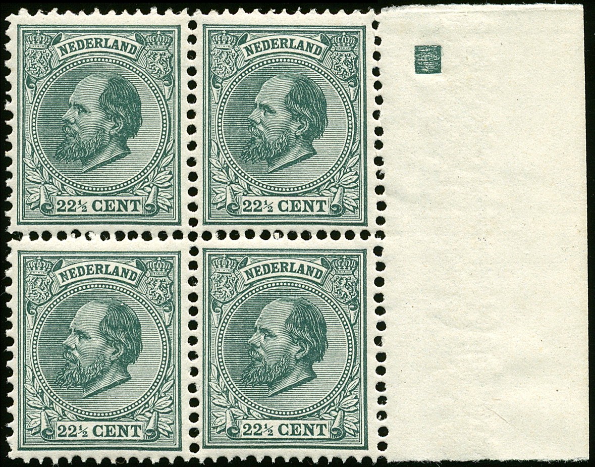 25, 22½ cent blauwgroen in postfris randblok van vier, het linkeronder ex. heeft twee minimale oxidatiepuntjes, overigens luxe!! € 5800