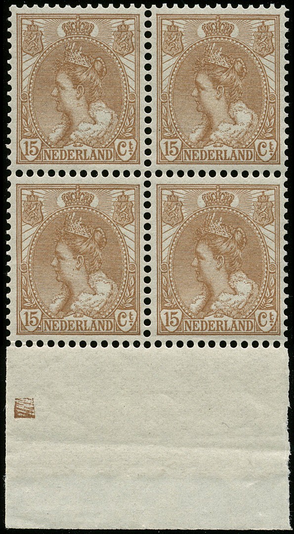 64, 15 cent bruin, luxe postfris blok van vier met ondervelrand € 2900