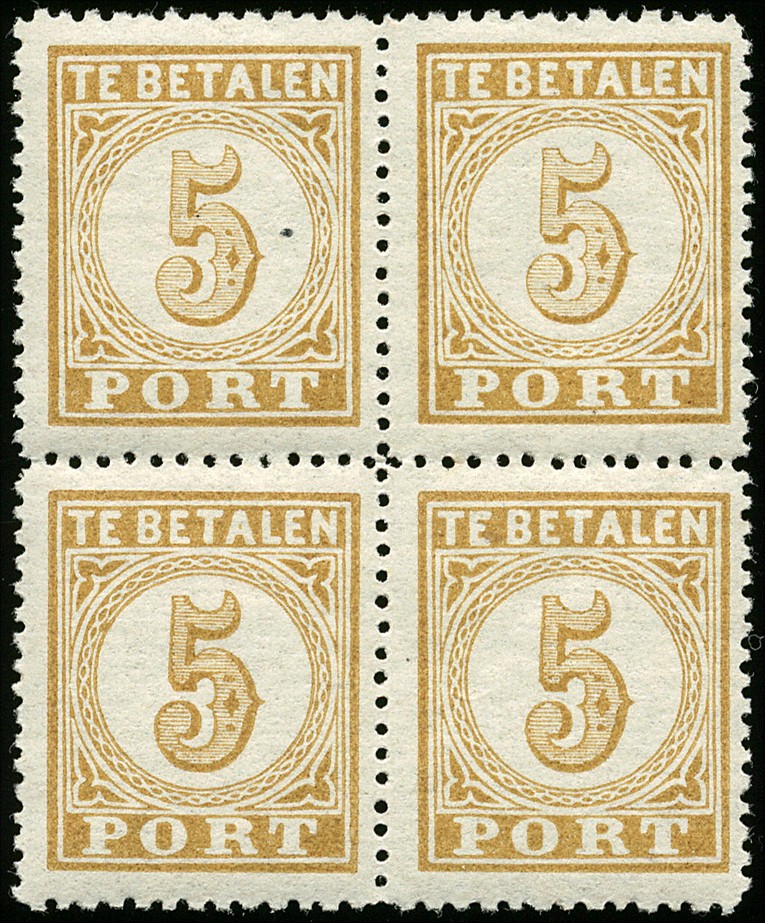 PORT 1, 5 Cent bruingeel in blok van vier met volle, originele gom en postfris, met een paar gebruikelijke, authentieke zwarte puntjes in het papier, op de zegel linksboven ook aan de voorzijde zichtbaar (dit is dus geen bevuiling of beschadiging!). Het blok is zeer fris van kleur, goed gecentreerd en prima getand, dus prachtig van kwaliteit. Voor de liefhebber! € 3800