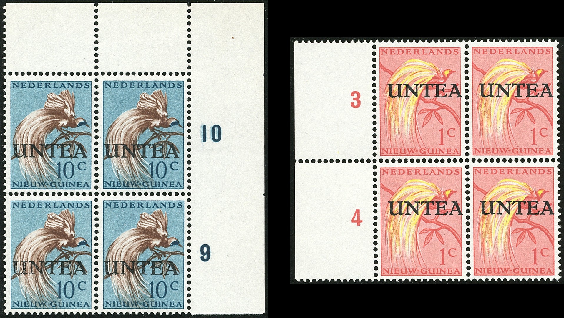 47/48, 1 Cent en 10 cent vierde en grote opdruk, in postfrisse rand- resp. hoekblokken van vier. € 1000