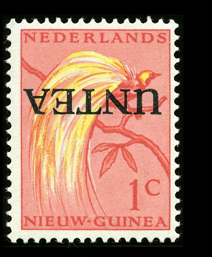 47fa, 1 Cent vierde en grote opdruk, met kopstaande opdruk, positie 88 in het vel bij een deel van de oplage, maximaal slechts 30 ex. (zie: 'Plaatfouten en (op)drukvariëteiten Nederlands Nieuw-Guinea', ZWP, blz. 113). € 1500