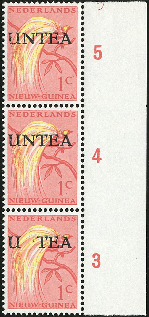 47fb (in NVPH niet gecatalogiseerd), 1 Cent vierde en grote opdruk, met variëteit 'Weggevallen N van UNTEA', positie 80 in het vel bij een deel van de oplage, maximaal slechts 11 ex. (zie: 'Plaatfouten en (op)drukvariëteiten Nederlands Nieuw-Guinea', ZWP, blz. 113). Grote UNTEA-rariteit!