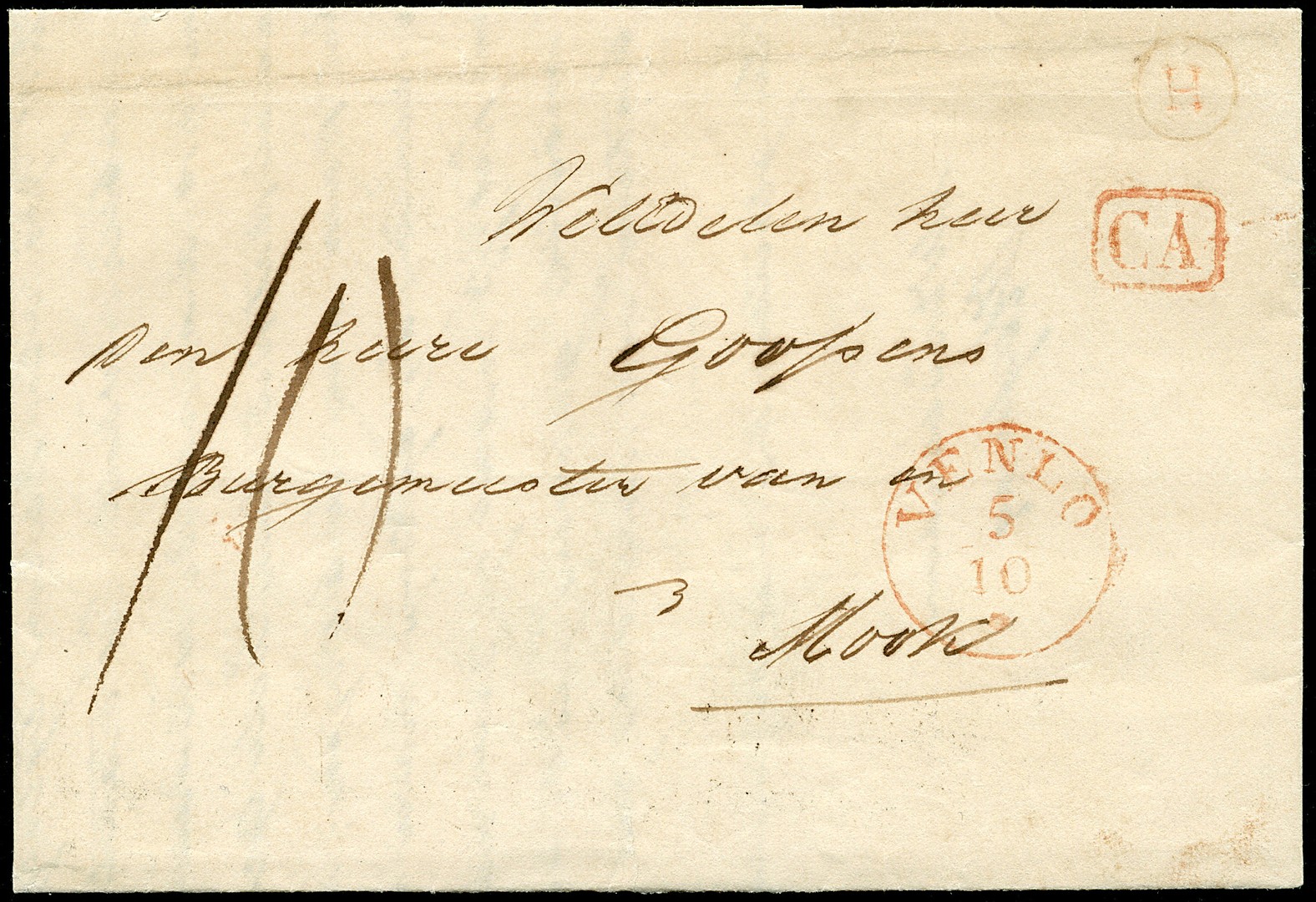 Service Rural. Vouwbrief van Arcen 5-10-1843 via Venlo 5-10 naar Mook, met op vz. brievenbusletter 'H' van Arcen waaronder in Venlo gestempeld 'CA' (brief bleef binnen arrondissement)
