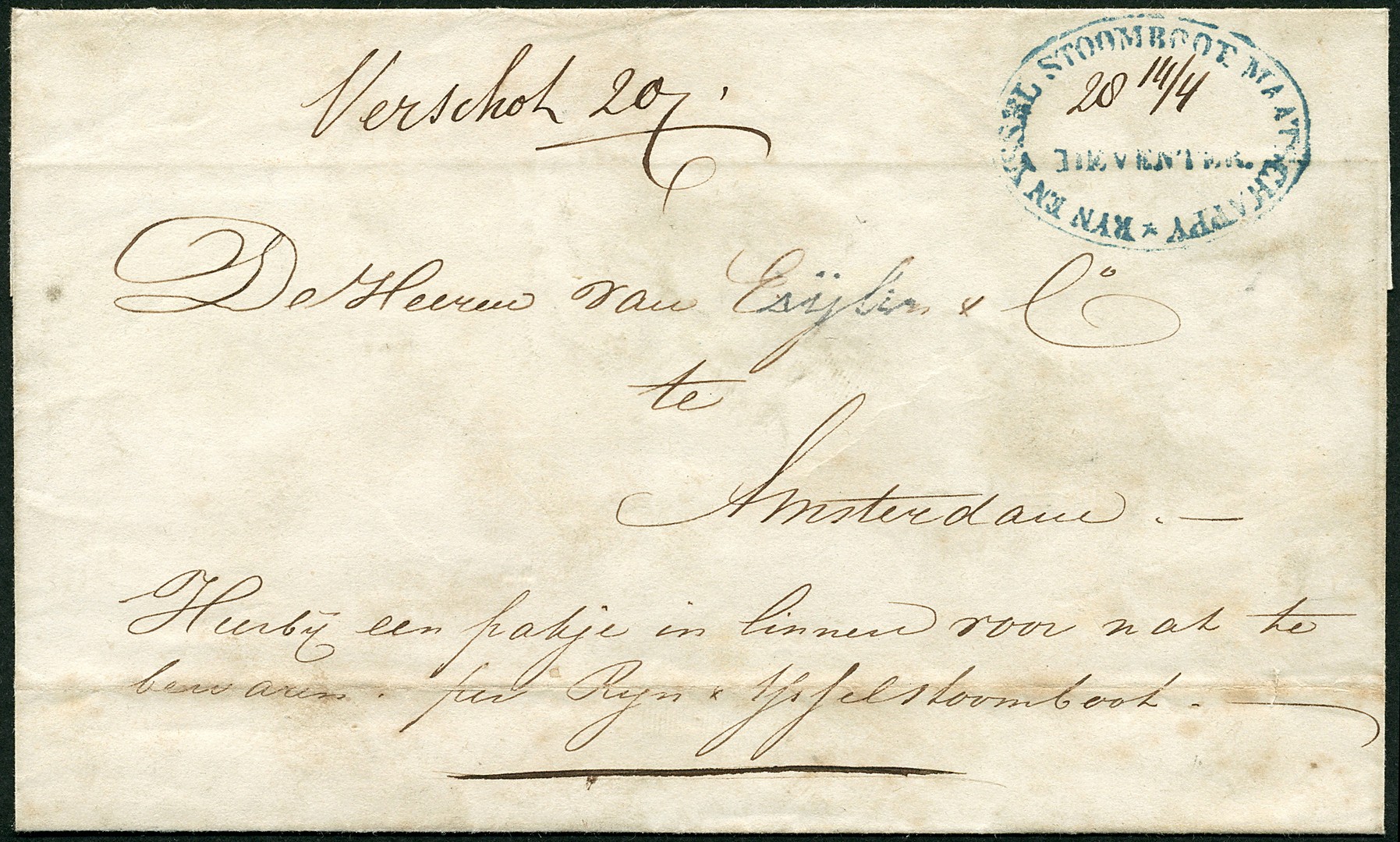 Ovaalstempels 'Ryn en Yssel Stoomboot Maatschappy / Kampen' in zwart op briefomslag van Kampen 20-11-1849 naar Amsterdam (PEP2.S394), alsmede 'Ryn en Yssel Stoomboot Maatschappy / Kampen' in zwart op briefomslag van Kampen 20-11-1849 naar Amsterdam (PEP2.S394)