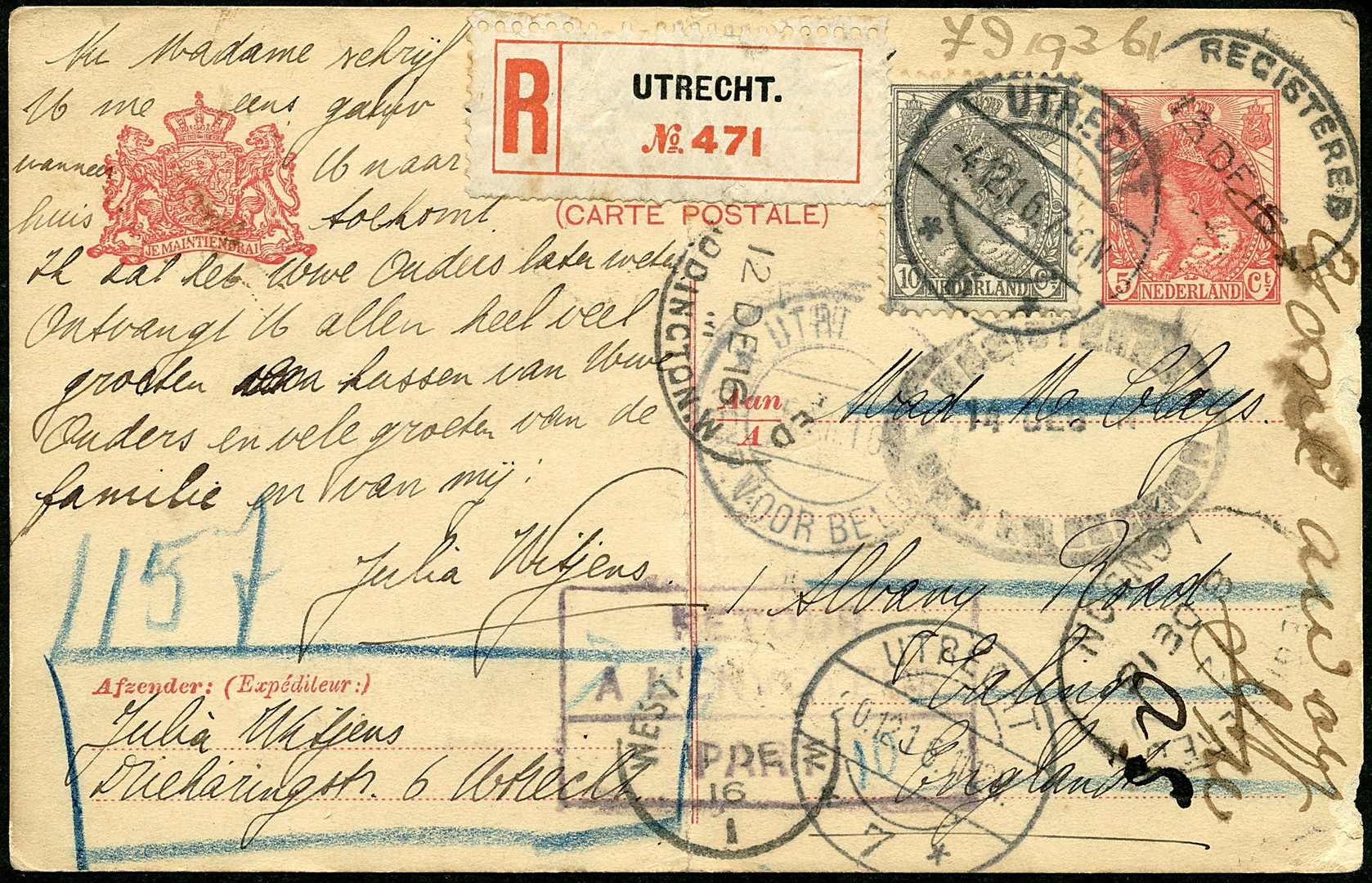 Bk. G84a-I (vrijwel prachtkaart) bijgefr. met 10c aangetekend van Utrecht 4-12-1916 via 'Utrecht / Exp. voor België' 5-12 (waarom op deze bk?) op zoek naar de geadresseerde te Ealing (GB), uiteindelijk retour Utrecht 20-12