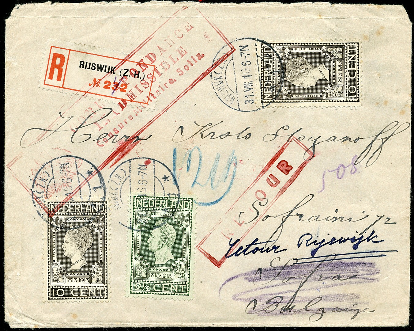 Jub. '13 2½c en 2x 10c op env. aangetekend van Rijswijk (Z.H.) 31-8-1916 naar Sofia 5-9, daar gecensureerd, az. tevens voorzien van etiket, retour Rijswijk 11(?)-9. Mooi gefrankeerd, schaars en interessant poststuk