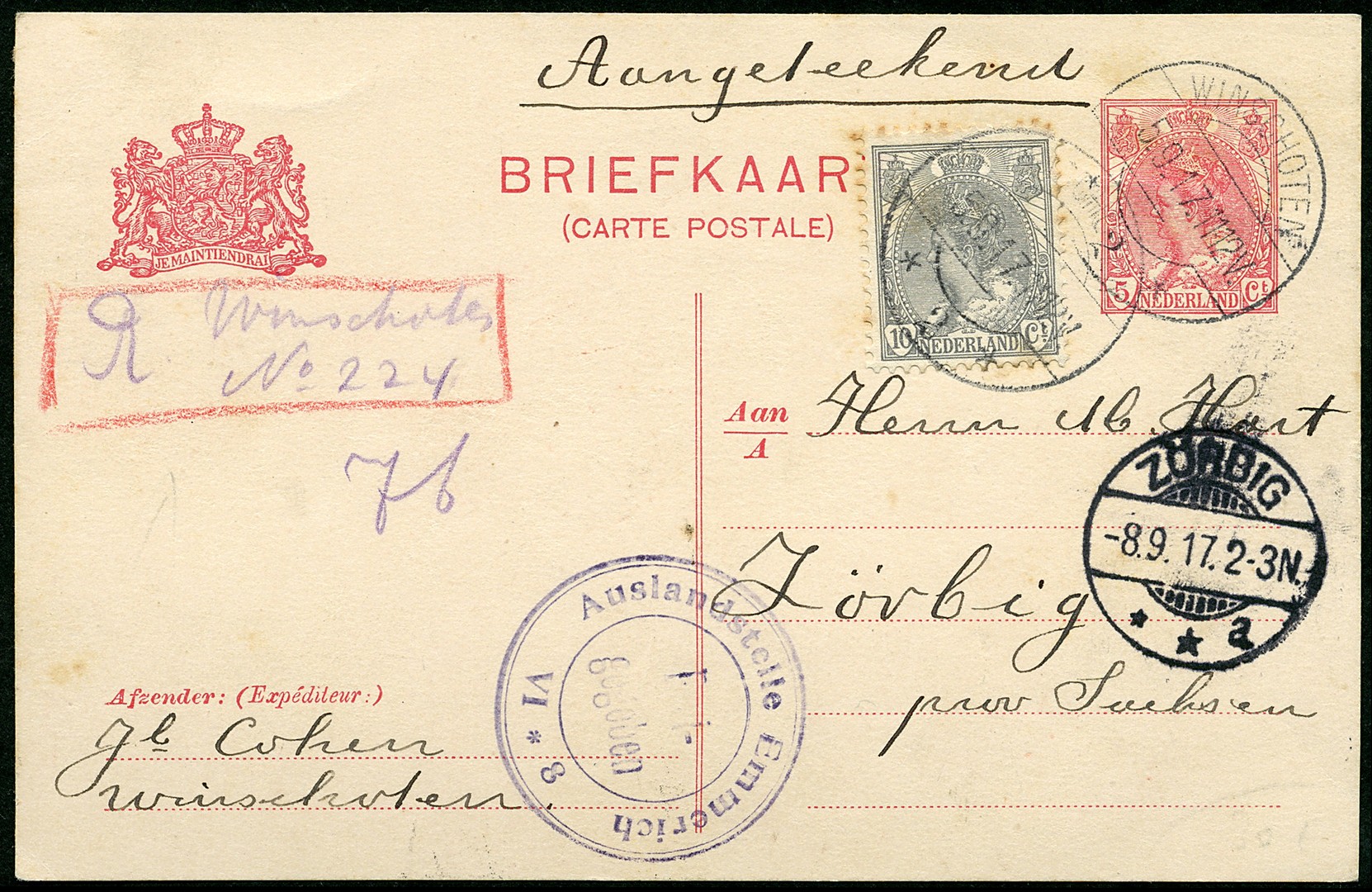 Bk. G84a-I bijgefr. met 10c van Winschoten 5-9-1917 over Emmerich naar Zörbig 8-9, met i.p.v. een R-strookje een geschreven aanduiding voor het aantekenen. Zeldzaam!