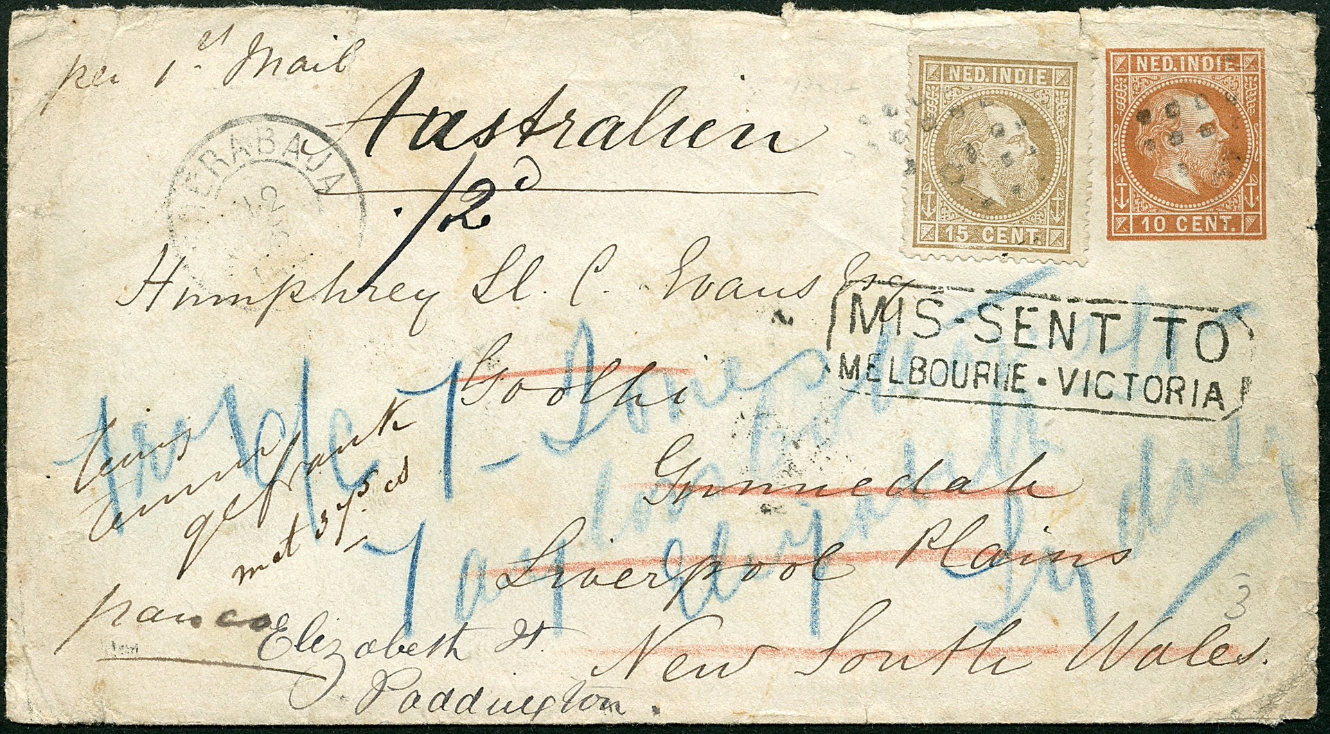 AUSTRALIË. Env. G1 bijgefr. met 15c nr. 11D van Soerabaja 12-5-1880 over Weltevreden 16-5 weer terug naar Soerabaja 24-5, vervolgens naar Gunnedale, New South Wales 15(?)-7, doorgez. naar Sydney maar eerst per abuis naar Melbourne 21-7, 'MIS-SENT TO / MELBOURNE-VICTORIA', daarna Sydney 24-7 en op 31-7 naar Elisabeth of Paddington. Opmerkelijke verzending met div. postale notities